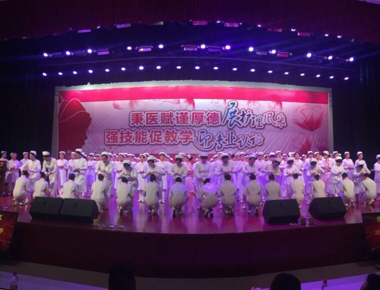此次活动共分为授帽仪式、护理技能比赛、护理专业形象展示三部分。在嘹亮而柔美的护士之歌中,2015级新生纷纷戴上了洁白无瑕的燕尾帽,并在公司党委书记贾秀英的带领下宣读了庄严而神圣的护生誓词,同学们手捧蜡烛高唱护士之歌,歌声响彻了整个礼堂,唱出了即将作为一名护理人员的自豪。授帽仪式之后,便是精彩而又紧张的护理技能大赛,此次比赛首次采用案例多站式的形式开展,将理论与操作相结合,考察了员工皮内注射、心肺复苏及静脉输液三项护理操作技能,及以现场提问的形式考察员工的临场应变能力。六组参赛同学共24名,来自不同年级的选手以娴熟的操作,专业的态度,专注的神情打动了评委及在场的每一位观众。比赛结束后由常务副经理郭永洪作了点评,她表示:深深被同学们的表现感动,同时也为同学们在比赛中展现出来的团队合作精神而欣喜,并期望技能操作比赛能越办越好!活动最后,护理礼仪展示队伍向观众展示了护理人员在操作中的推、蹲、坐、站等姿态,举手投足间无一不展示了护理独特的礼仪风采和文化魅力。