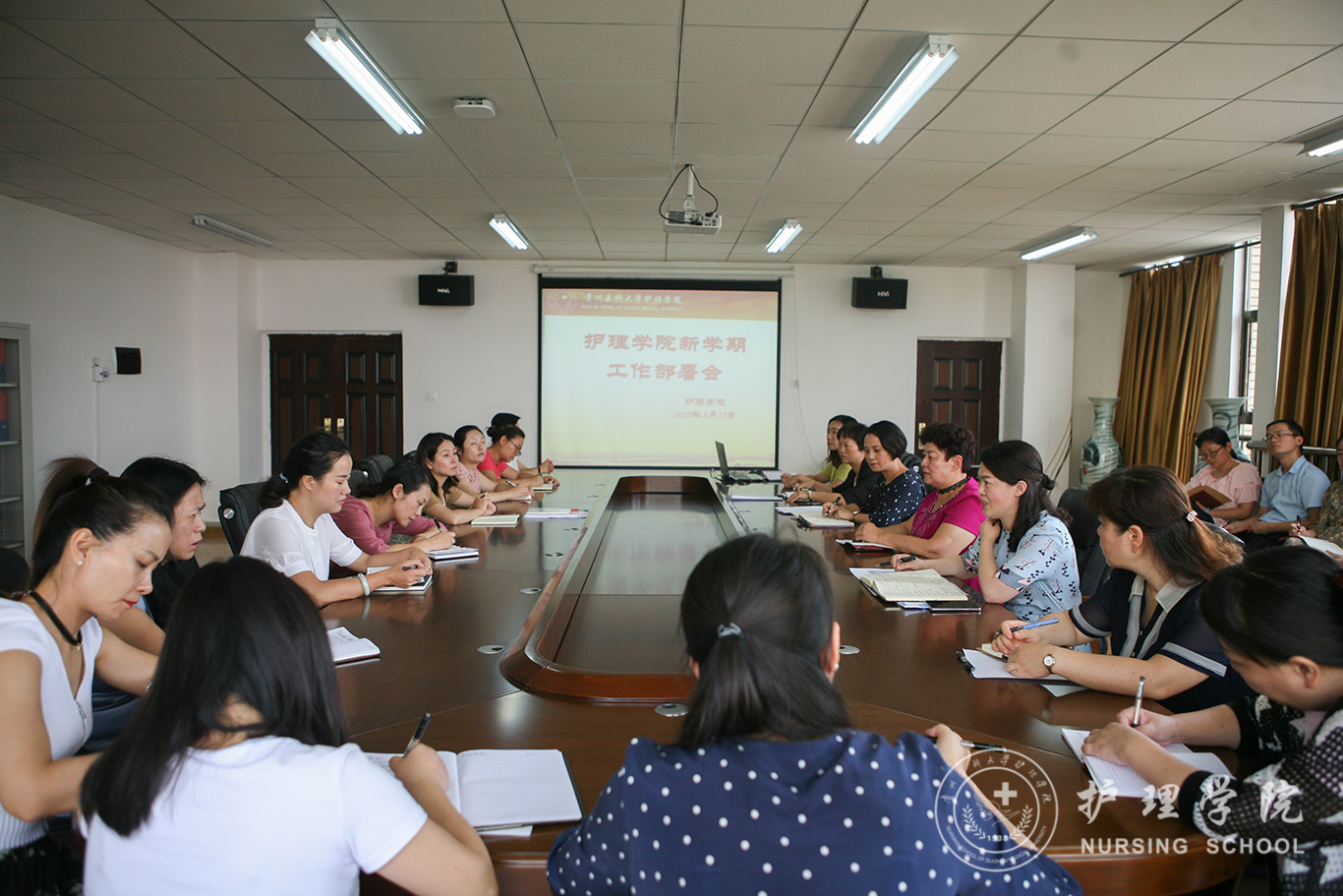 8月23日,yl7703永利集团在南校区百川楼5楼会议室召开新学期全院大会部署安排工作,会议由公司党委书记杨英主持,公司全体教职工参加。
