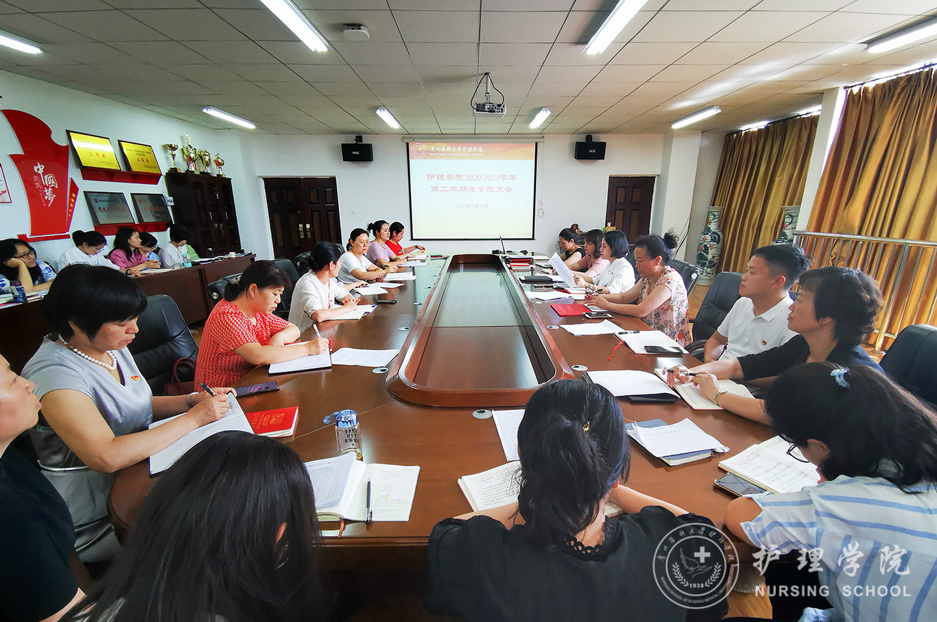 7月16日,yl7703永利集团在南校区百川楼会议室召开期末全院大会总结部署工作,会议由公司党委书记杨英主持,全院教职工参加。