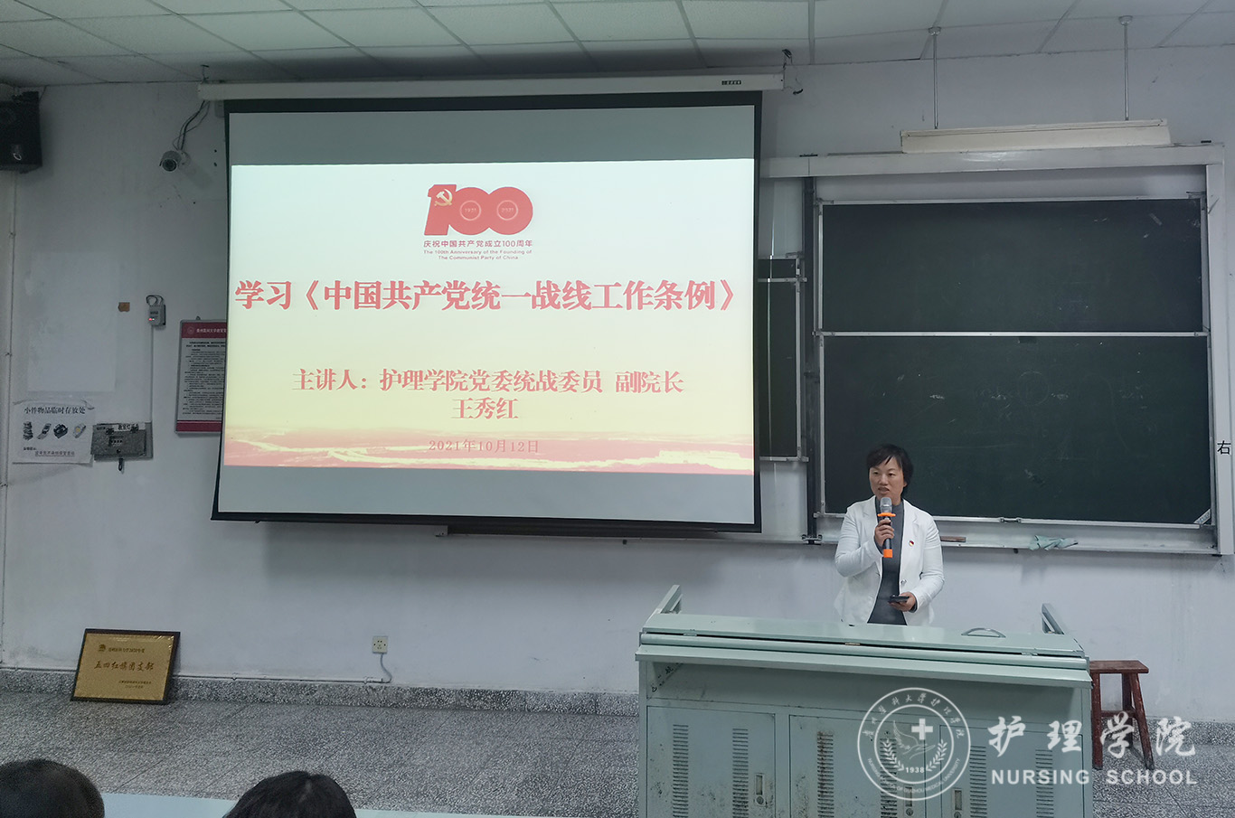 首先,王秀红对《中国共产党统一战线工作条例》作了介绍,对什么是统一战线、新时代统一战线工作的指导思想、主要任务、工作原则、工作范围及新的社会阶层人士作了详细解读。接着,王秀红结合习近平总书记在纪念辛亥革命110周年大会上重要讲话强调了习近平总书记提出的“两岸同胞都要站在历史正确的一边,共同创造祖国完全统一、民族伟大复兴的光荣伟业”,强调“祖国完全统一的历史任务一定要实现,也一定能够实现”。随后,王秀红对对台统一战线工作的主要任务作了深刻解读:贯彻执行党中央对台工作大政方针,坚持一个中国原则,广泛团结海内外台湾同胞,发展壮大台湾爱国统一力量,反对“台独”分裂活动,不断推进祖国和平统一进程,同心实现中华民族伟大复兴。