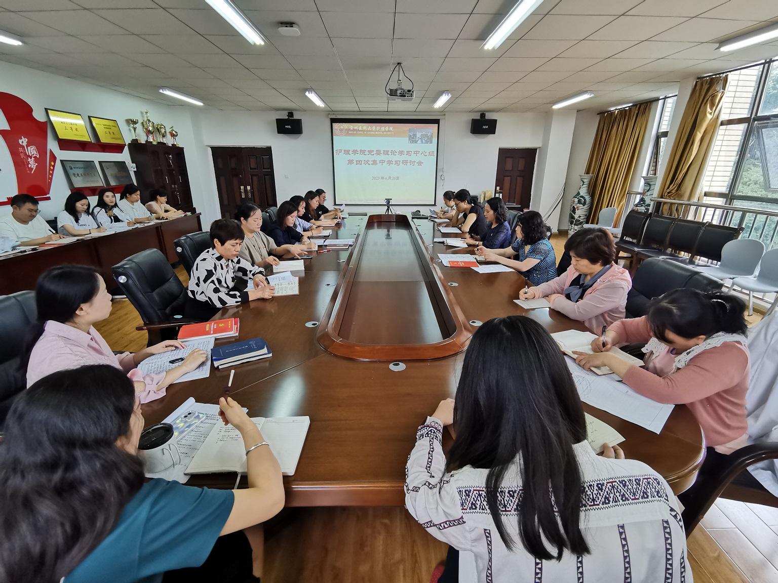 6月26日,yl7703永利集团在南校区百川楼五楼会议室开展党委理论学习中心组第四次集中学习研讨,公司党委委员、副科级以上干部、党支部书记和全体辅导员参加,会议由公司党委书记杨英主持。