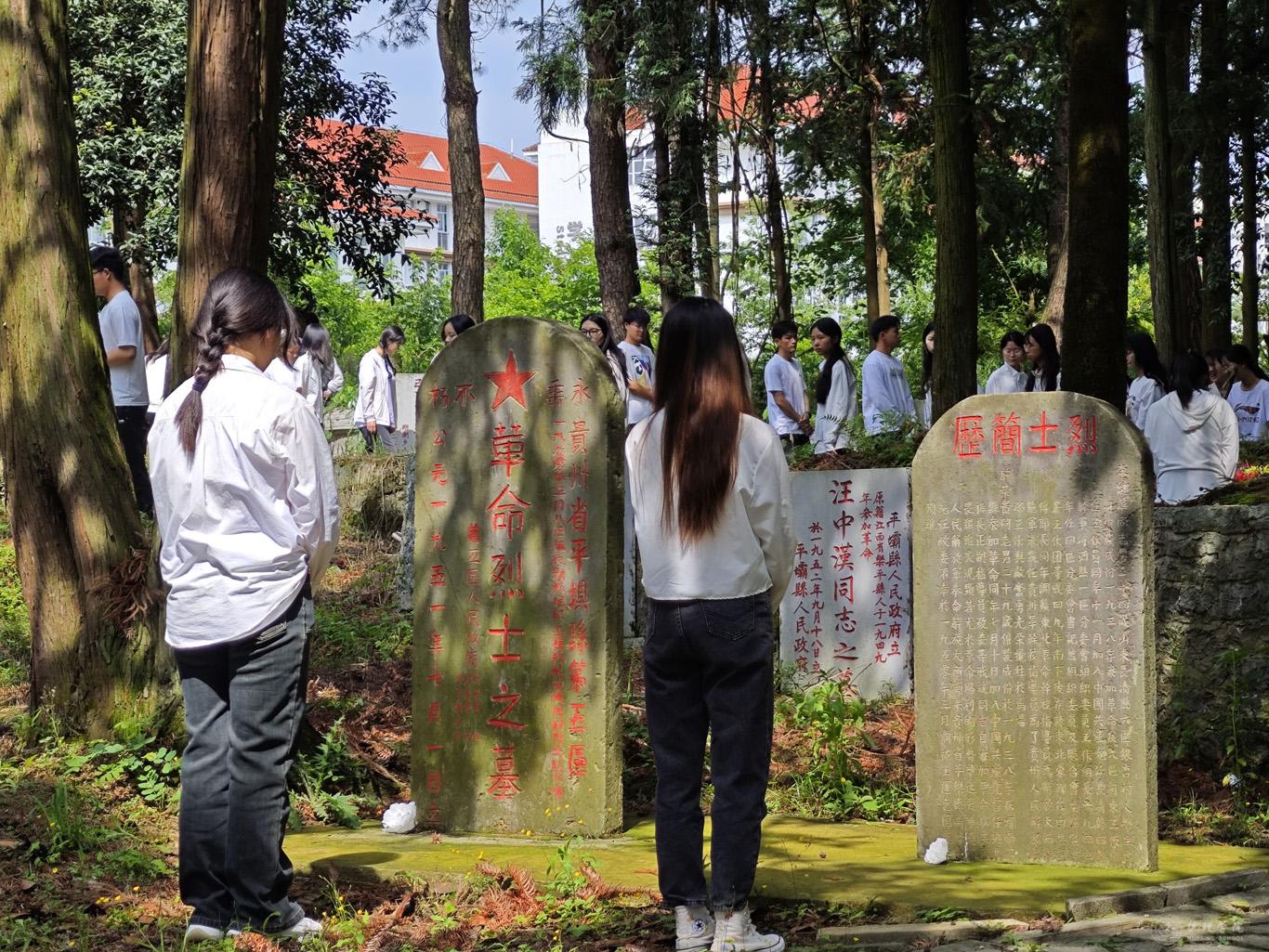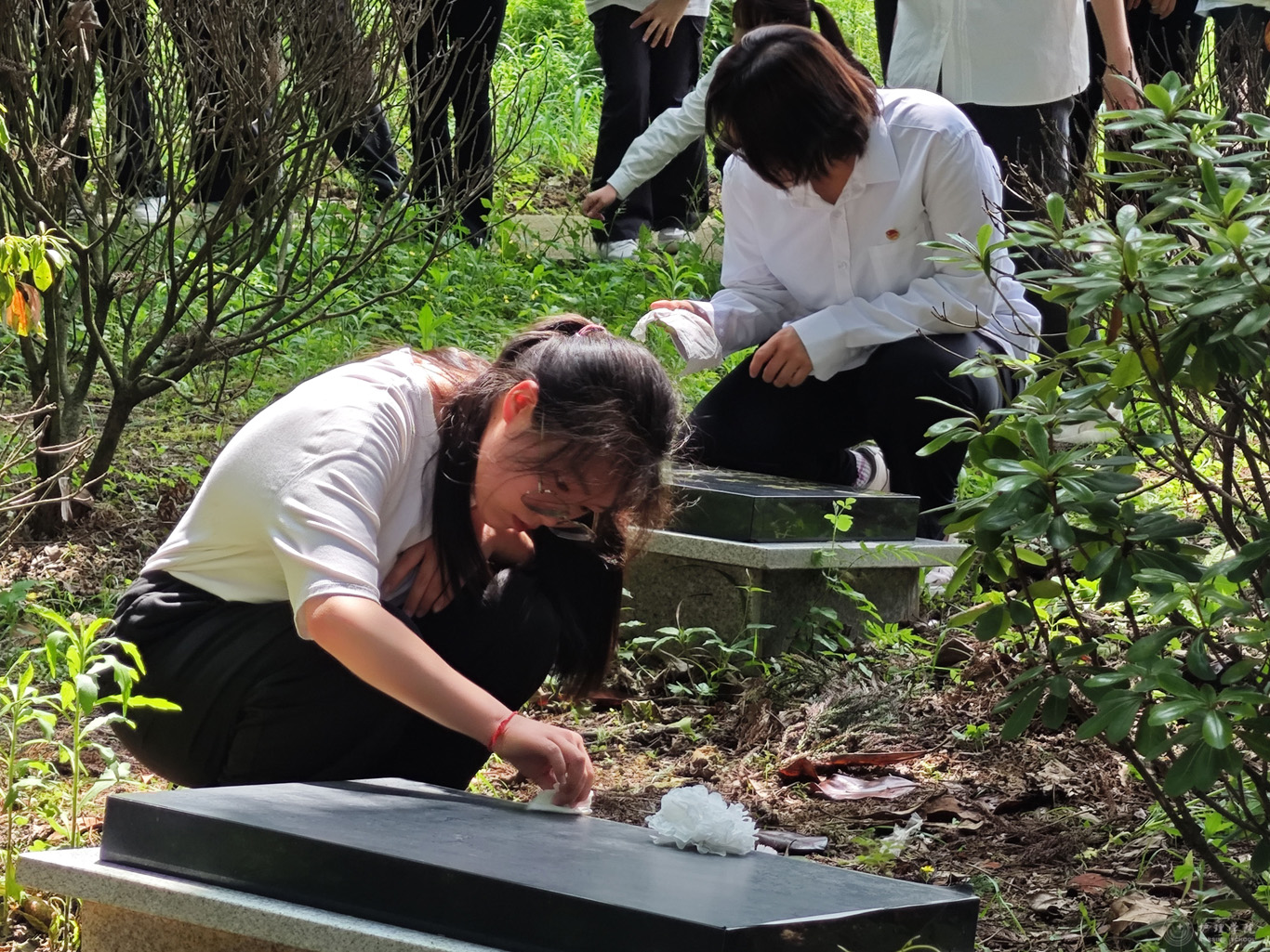 鲜花朵朵,祭奠英魂。每一位同学佩戴团徽,手捧自制的白花,绕行烈士纪念碑一圈,向烈士们敬献花朵,同学们纷纷主动拿起纸巾擦扫墓碑,以此祭奠烈士,寄托心中的敬仰之情。