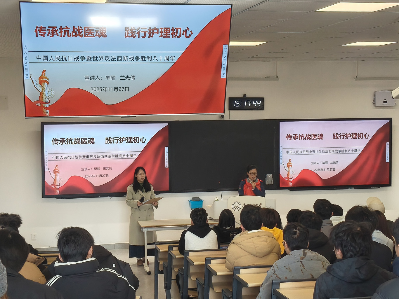 宣讲结束后,同学们纷纷表示,护理先辈的故事绝非尘封的历史,练习无菌操作时,当铭记章央芬编著教材的严谨;直面学习困境时,当传承丁志辉绝境坚守的毅力。未来步入岗位,他们都将以先辈为榜样,用白衣执甲的担当,书写新时代属于护理人的爱国篇章。