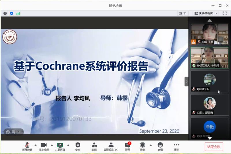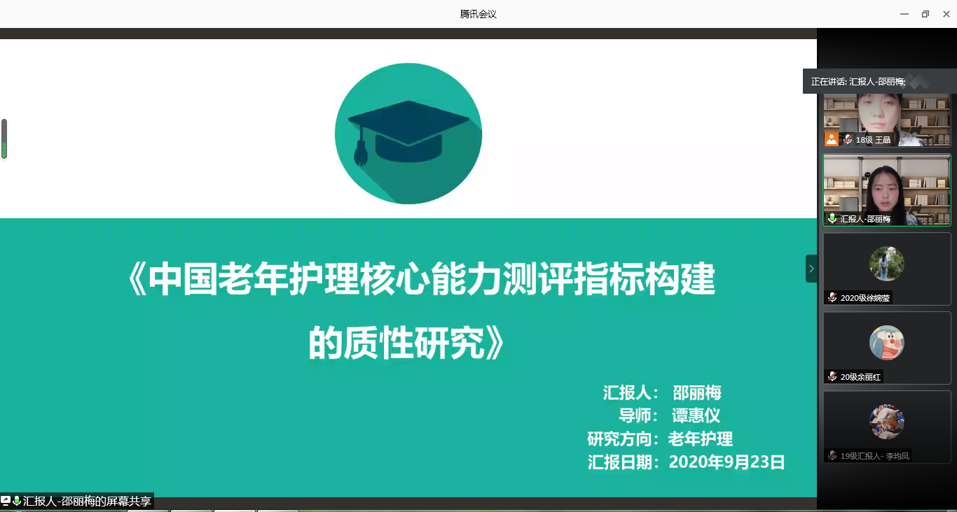 本次读书报告会由2018级老年保健与护理方向研究生王晶主持。读书报告会分为研究生汇报和师生点评两个部分进行。首先由2019级研究生李均凤、邵丽梅、唐帆3位同学以PPT的形式进行分享。随后参会老师和同学对3位同学的汇报逐一进行点评,为员工提出建设性意见,提供专业性指导,展开讨论交流。