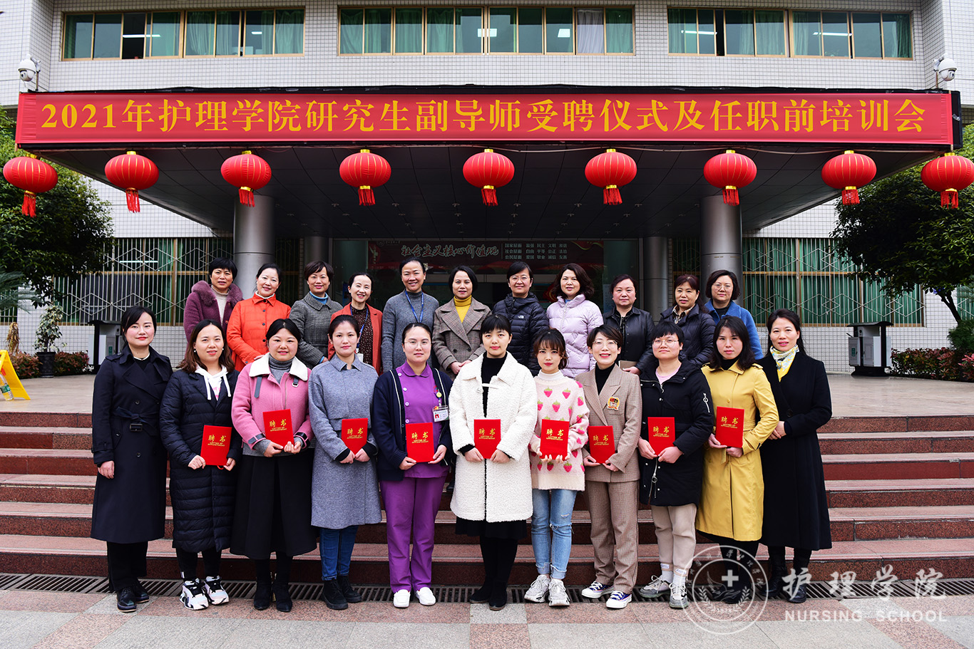 受聘仪式开始前王秀红介绍公司研究生副导师遴选工作的开展过程和情况。随后,刘志燕宣读副导师名单,杨英、李亚玲为副导师颁发聘书。赵雪作为副导师代表讲话并表态,一定会珍惜宝贵的锻炼机会,加强自身学习和建设,认真配合好导师工作,为培养出高质量的硕士研究生而努力。附属医院护理部副主任蔡鹏代表导师发言,她对副导师的加入表示热烈的欢迎和深切的期待,希望副导师充分发挥科研特长和专业特长,大胆工作,与导师一起携手把公司产品好。李亚玲讲到副导师作为新生力量的注入,要充分积极发挥自身在科研、教学、专业等方面的优势,不断学习,互帮互补,快速成长,为促进护理学科高质量发展起到承上启下的重要职责和作用。杨英讲到副导师的遴选和加入,开启了公司护理学科发展的新起点,她勉励在座的教师要不断增强使命感、责任感,以身作则,落实立德树人的根本任务,勤奋创新、虚心学习,促进护理学科高质量发展。受聘仪式后全体参会人员在行政楼前合影。