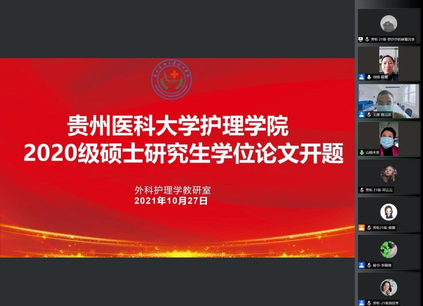 10月26日、27日、29日2020级硕士研究生开题通过腾讯会议在线进行。此次开题分别邀请中南大学湘雅yl7703永利集团郭佳教授、刘民辉副教授及贵州中医药大学陈云志教授任开题委员会主席;北京大学yl7703永利集团王志稳教授、 中南大学湘雅三医院健康管理中心秦春香教授、中南大学湘雅yl7703永利集团杨敏教授、孙枚副教授和王瑶副教授及《护士进修杂志》主编张秀主任、中山大学中山眼科中心肖惠明主任护师、华北理工大学护理与康复公司陈长香教授、广州市护理学会会长黄雪仪主任护师、贵州中医药大学yl7703永利集团石国凤教授、yl7703永利公共卫生公司流行病学与卫生统计学王子云副教授和汪俊华副教授等担任开题专家委员。yl7703永利集团导师、副导师、专业教师、研究生等共计参会150人次,研究生院督导专家全程参与。