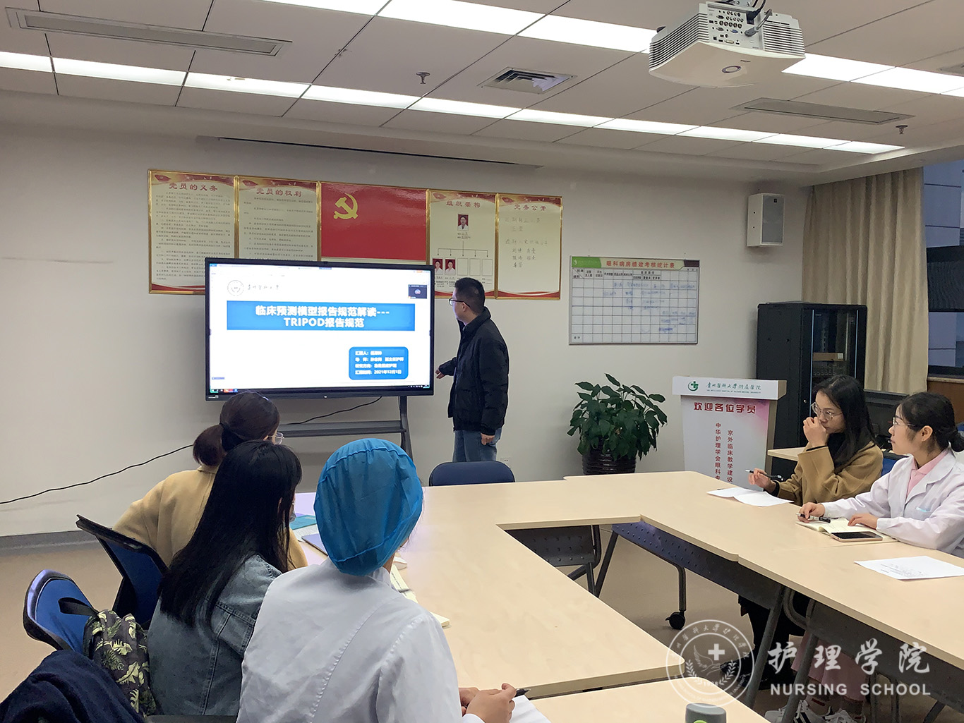 汇报环节首先由郭娟介绍问卷的信效度检验,她从问卷编制概述、问卷信效度检验和问卷伦理等三个方面加以阐述,并结合自身课题中编制的问卷为同学们进行信效度的实操讲授,使同学们了解了问卷信效度检验的基本概念、流程以及注意事项。接下来岳果林汇报了临床预测模型报告规范解读—TRIPOD报告规范的介绍。他从TRIPOD报告规范组成条目、预测模型的开发、验证过程及应用做了分享,让同学们对疾病风险预测模型有了更清晰的认识。主汇报结束后,参会同学积极提问及发表观点,现场讨论气氛热烈。针对同学们的汇报及讨论,参会老师进行了认真点评和指导。
