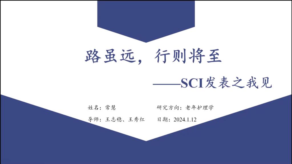 两次荣获国家奖学金、已发表SCI论文5篇、中文核心期刊论文2篇的2021级护理学硕研究生常慧以“路虽远,行则将至——SCI论文发表之我见”为题,分享自己在SCI论文选题、写作、选刊、投稿及稿件返修等有关SCI高水平论文发表全过程的经验。此外,也为在座同学悉心讲解了SCI论文发表每一阶段的写作及投稿技巧。