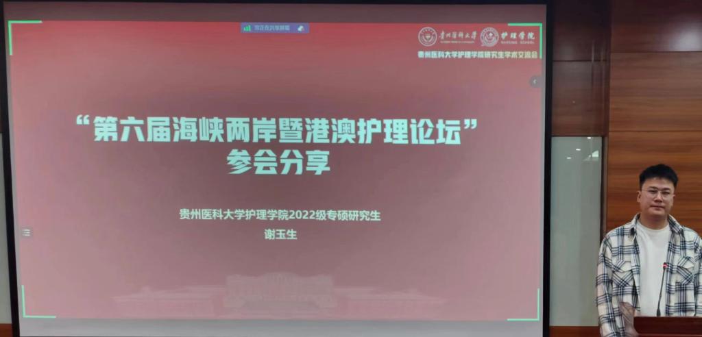 会上,2022级护理专硕研究生谢玉生就参加“第六届海峡两岸暨港澳护理论坛”大会交流的心得体会进行分享。他围绕“全民健康覆盖”主题介绍了目前国际、国内相关研究现状及政策方针;此外,也向大家讲解目前海峡两岸及港澳地区优秀护理同仁的学术成果及研究前沿。