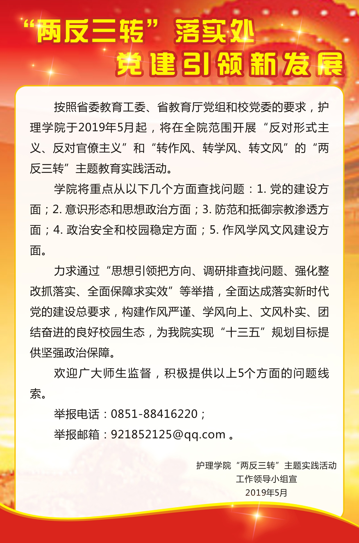 (四)设立并公开“两反三转”主题实践活动的举报电话、邮箱,制作海报张贴,畅通举报渠道,方便广大教职医护员工生反映、举报相关问题。公司“两反三转”主题实践活动举报电话:88416220, 邮箱:921852125@qq.com。