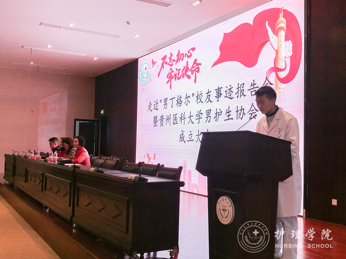 成立大会结束后,男护生协会的首秀活动——“不忘初心、牢记使命”走进“男”丁格尔员工事迹报告会拉开帷幕。本次报告会邀请到2009届优秀员工,贵州省人民医院急诊留观输液中心护士长杜伟和护理学2018级唐郅尧同学作为演讲嘉宾。杜伟分别从“我是谁?我从哪来?我要做什么?”三个方面讲述自己的学业、事业经历,向同学们展示了作为一位男护士在学习中的应该做到全面发展,提高专业归属感。以一个男护士在临床工作中运用自身独特的思维模式和对工作的热爱为维护健康、促进健康做出的努力,并因此成就自己,实现了自我价值。由此激励同学们热爱护理学、助产学专业,有为才能有位,有为才能沿着梦想之路前行。唐郅尧结合自身学习经历的做了经验交流发言。他表示我们要微笑着面对困难,坚持就是胜利。两位嘉宾的演讲引发了现场师生的共鸣,演讲过程中多次响起热烈的掌声。
