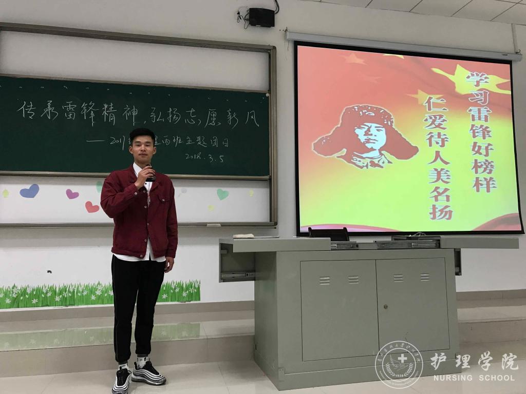 本次主题团日活动内容丰富多彩,2016级护理学助产班以PPT的形式向同学们展示了雷锋同志的先进事迹,让同学们了解雷锋,熟悉雷锋精神;2016级护理甲班带领同学们再次回顾学习了十九大精神,鼓励大家发挥志愿者作用;其他班级则通过网络新媒体,消除同学们对雷锋精神存在的质疑,或以视频的形式向同学们宣传新时代青年应该弘扬的雷锋精神。活动中,每位同学都怀着无比崇敬的心情,聆听革命先辈的事迹,深受教育。