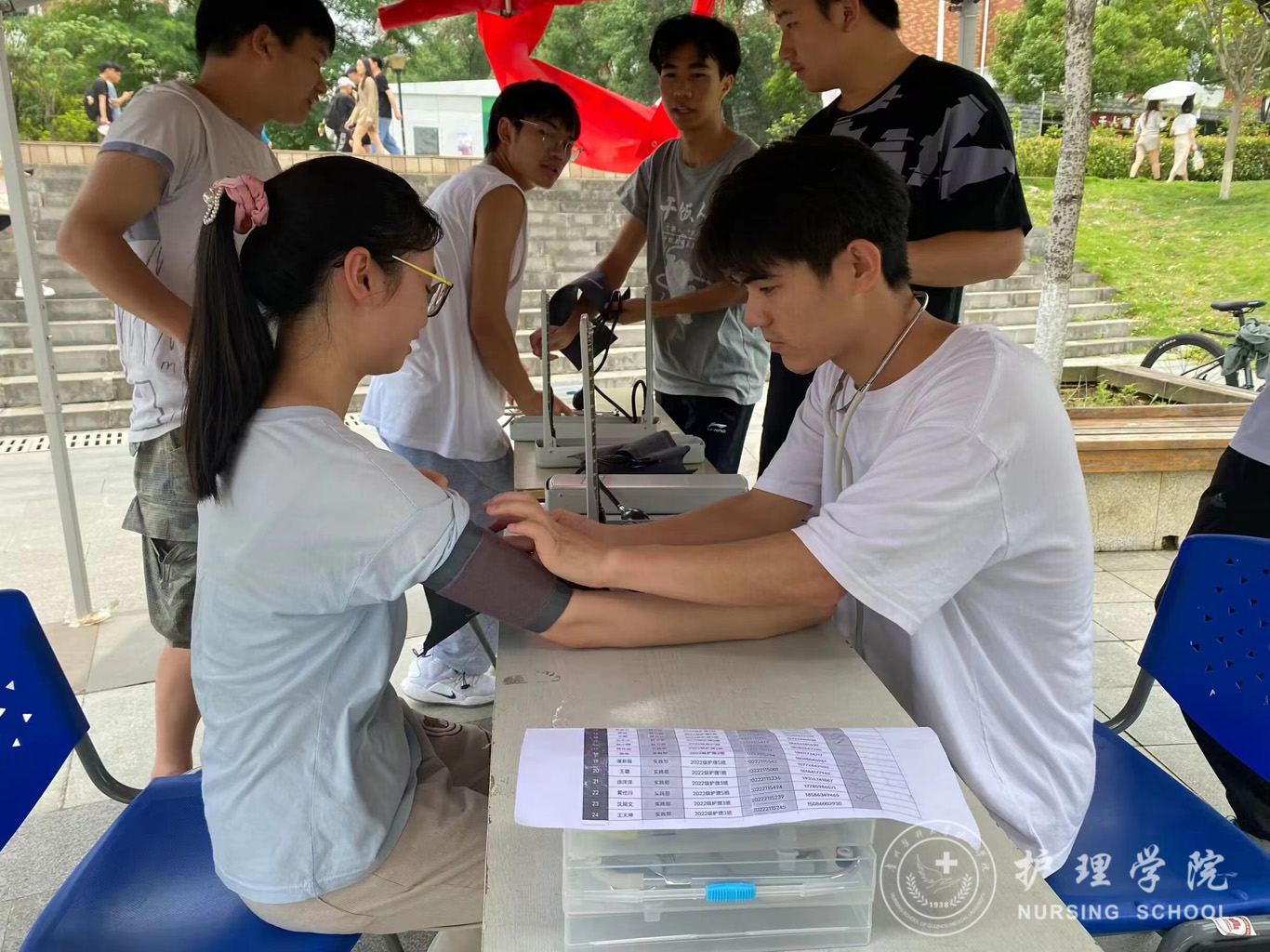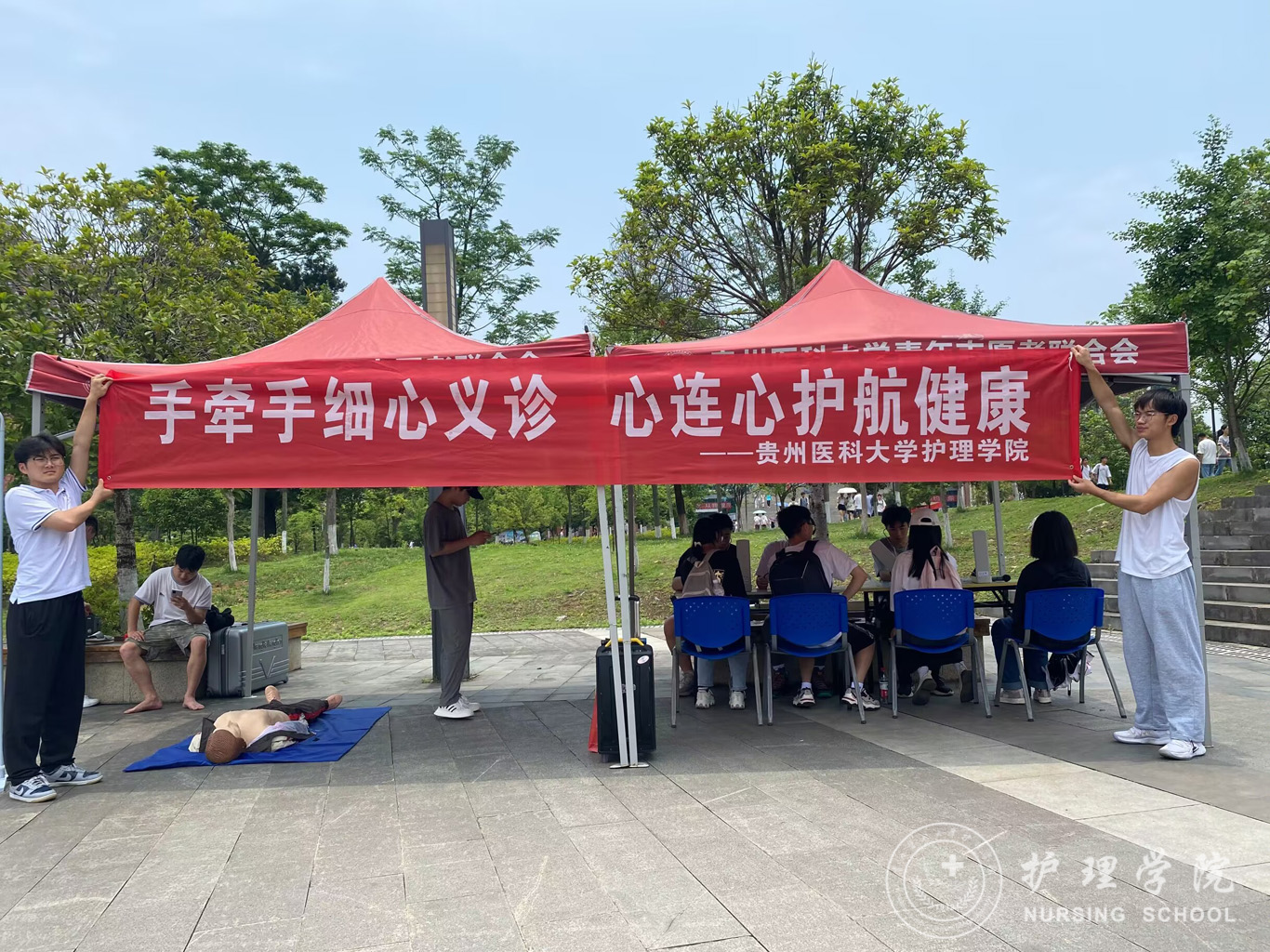6月2日,为深入学习贯彻党的二十大精神,在学习贯彻习近平新时代中国特色社会主义思想主题教育中落实“健康中国”战略,加强在校老员工急救知识技能知识学习,提高自救互救能力,yl7703永利男护生协会与yl7703永利集团护理技能协会在南校区一食堂小广场联合举办了“手牵手细心义诊,心连心护航健康”急救知识技能培训活动,活动面向全校同学开展。