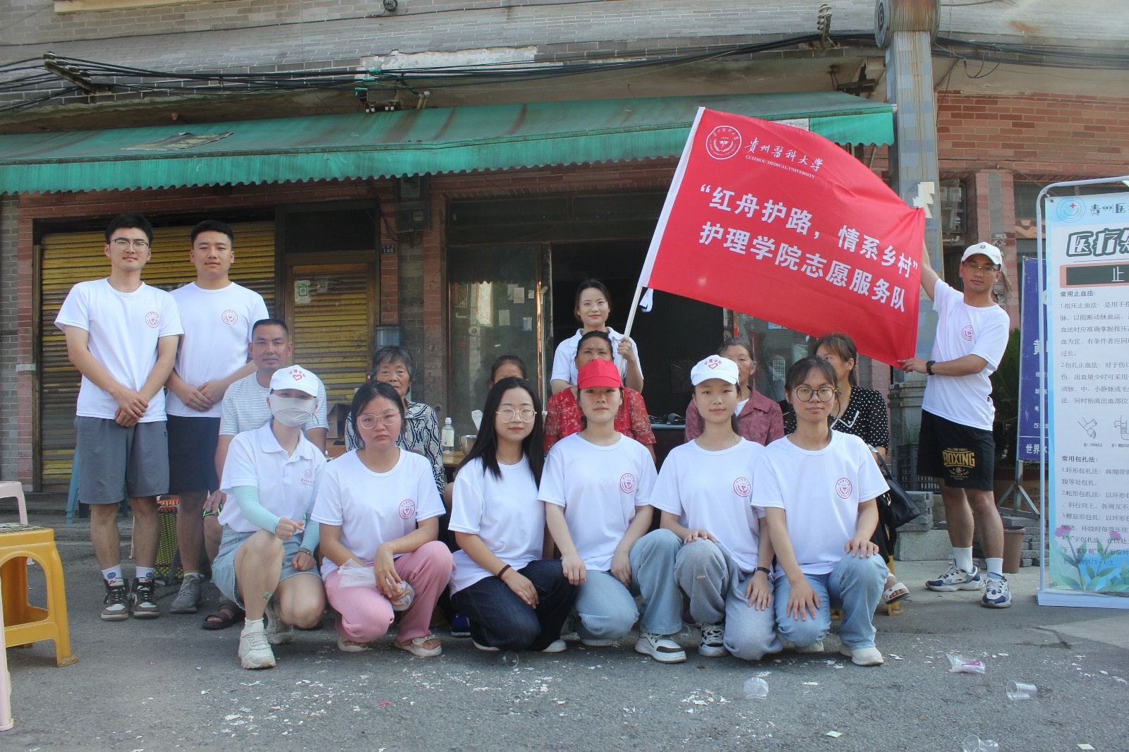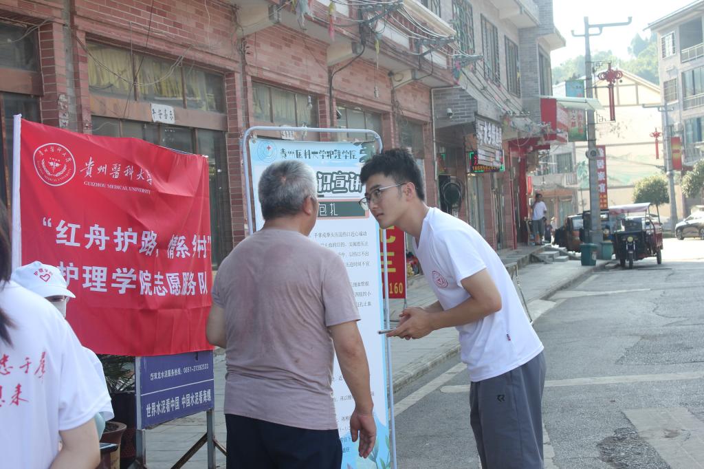 健康问诊:实践服务队成员们将专业知识与技能实操有效衔接,以免费测量血压为主项目,延伸开展了老年人健康现状调研、急救知识普及、禁毒防艾政策宣讲等活动。