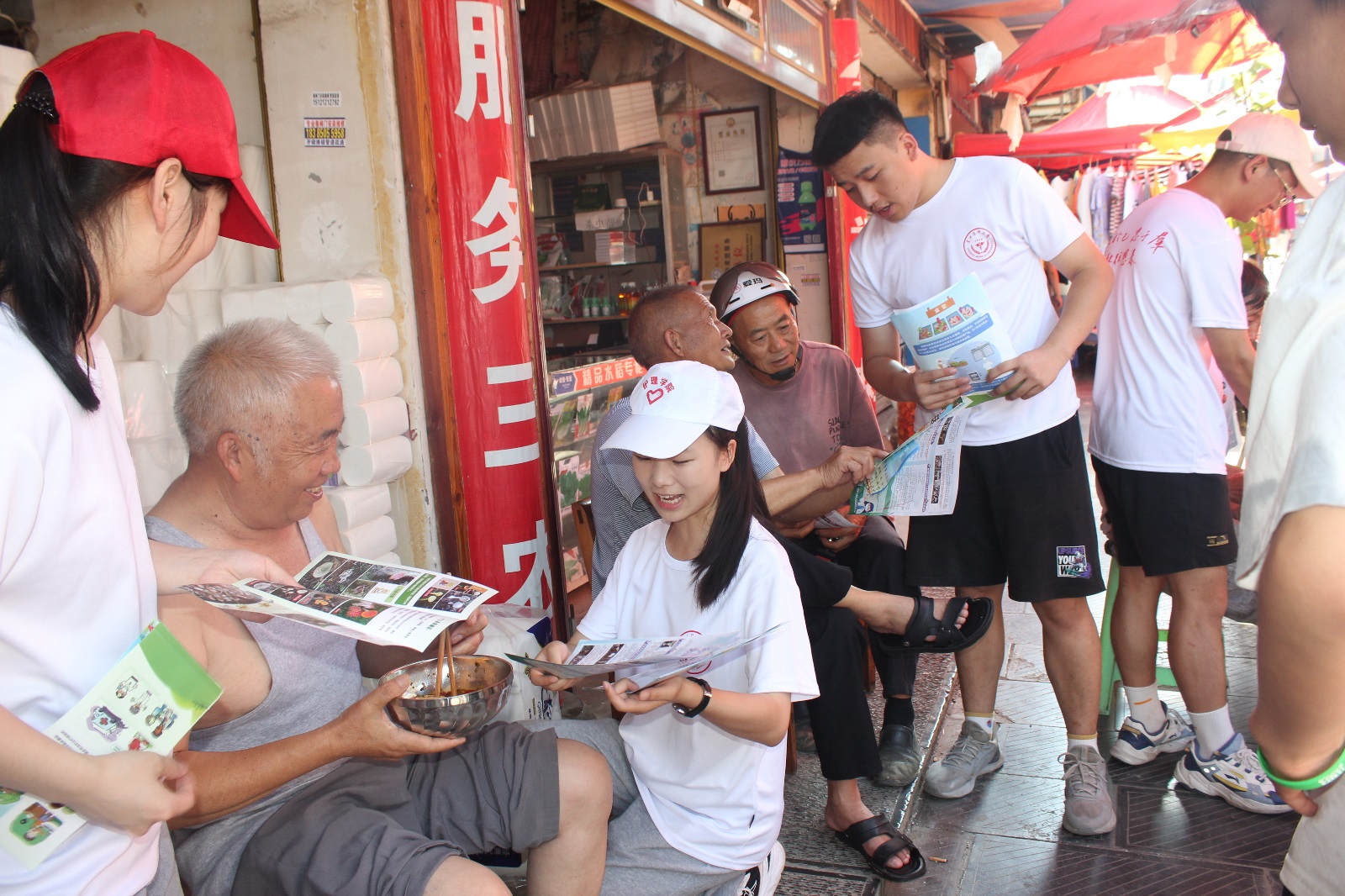 发放健康知识宣传单:服务队在石板镇集市发放了夏秋季食物中毒防控知识宣传单以及高血压、糖尿病等常见病宣传单,问询了解石板镇居民日常饮食及生活习惯,普及健康的知识。