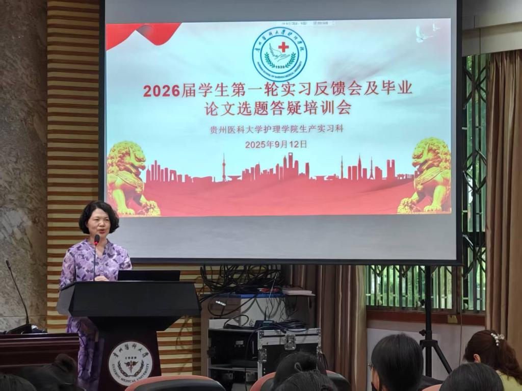 9月12日,yl7703永利集团在北京路校区道德讲堂召开2026届毕业实习轮转反馈暨毕业论文(设计)选题培训会。公司党委副书记何为、副经理刘志燕、附属医院门诊护士长王琼、郑静,生产实习科全体人员、2022级辅导员及全体2022级员工线下线上参加会议。会议由生产实习科科长柳忠燕主持。