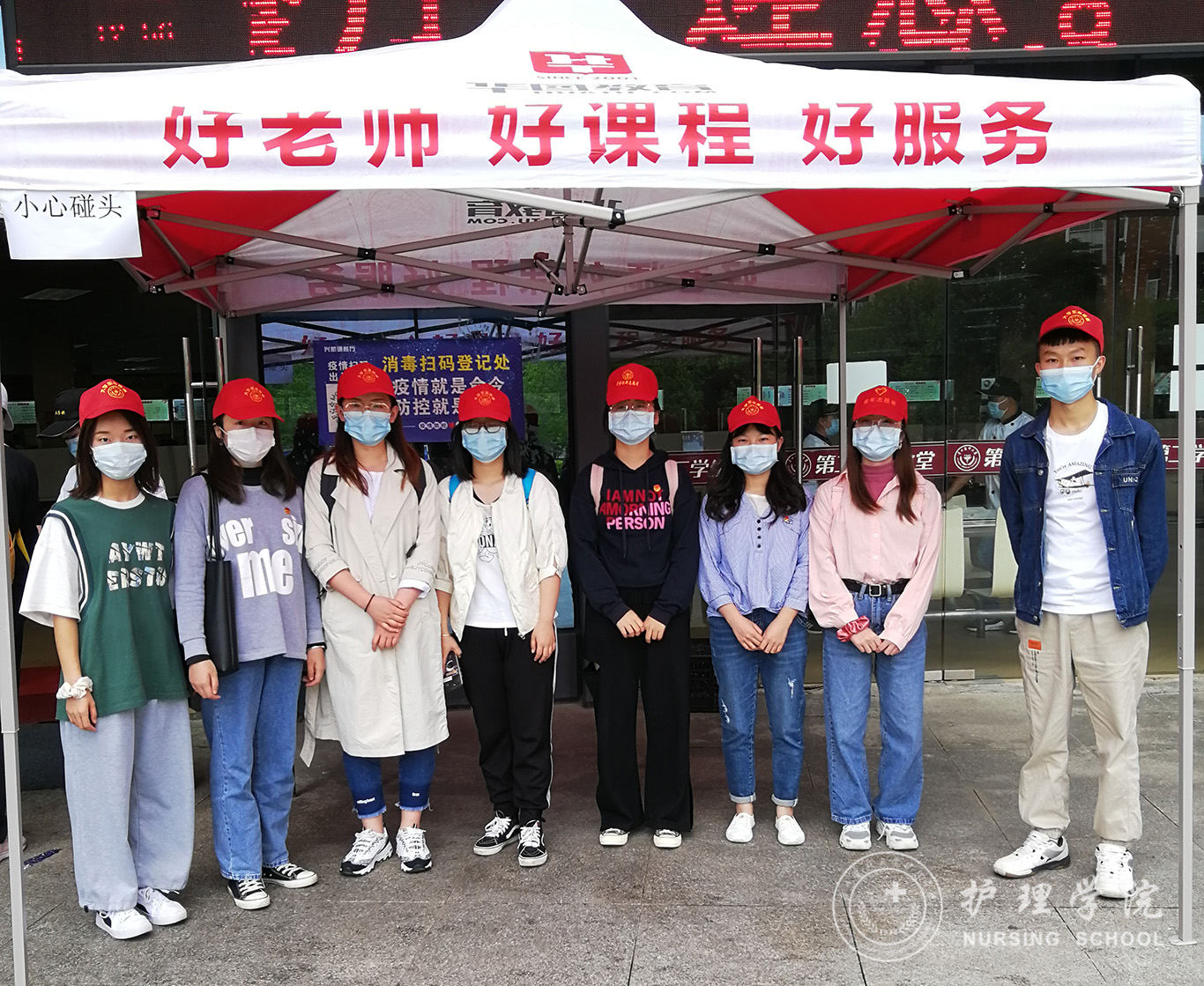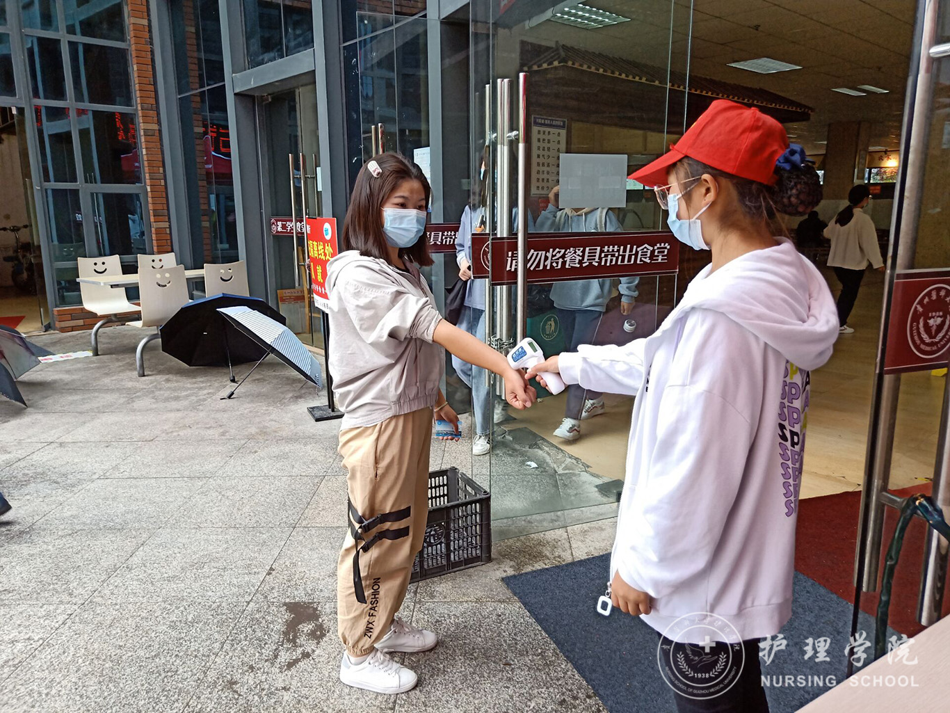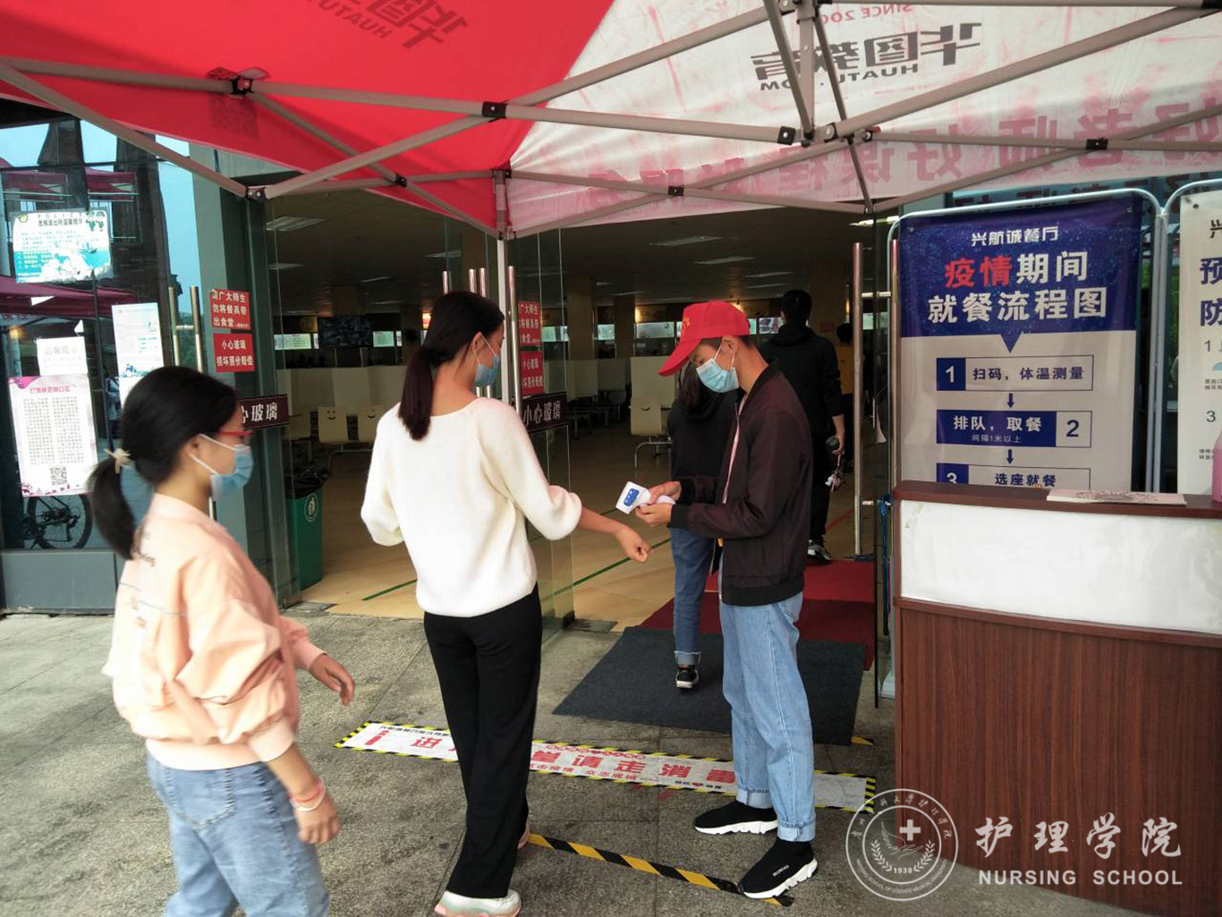 5月25日到5月29日,2018级护理学甲班团支书蓝阔耀组织发展对象及入党积极分子到二食堂开展测体温志愿服务活动。志愿者们分好组之后就分批于二食堂的各个入口处值班,为进出的师生测量体温并监督其正确佩戴口罩。