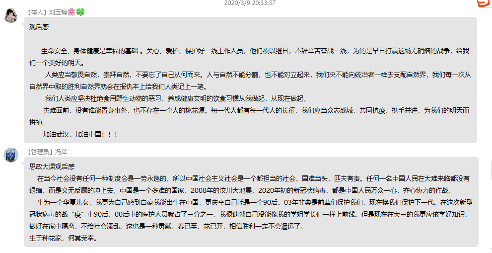 课程结束后,各班同学通过QQ群、微信群、腾讯会议等平台围绕课程内容和自身实际开展在线讨论,分享所学、发表感悟、交流心得。通过学习讨论,同学们主要有以下收获:一是要热爱党和国家。同学们相信在党和国家的领导下,我们一定可以打赢这场疫情防控的人民战争。二是要坚定“四个自信”。同学们从这场疫情防控阻击战中进一步增强了道路自信、理论自信、制度自信、文化自信。三是要服务人民群众。同学们认识到了要努力学习知识,积极进行实践,增强服务人民群众的本领。四是要勇于担当作为。同学们认识到了“白衣天使”是战“疫”一线“最美逆行者”,要向“白衣天使”学习,用心守护着每一个病人的生命安全。五是要保护自然环境。同学们认识到了自然环境是人类社会赖以存在的基础和前提,要遵循自然规律,保护生态环境和野生动物。六是要珍视生命健康。同学们认识到生命健康是幸福生活的重要前提,要热爱生命,保障健康。