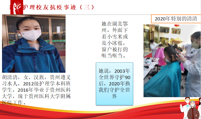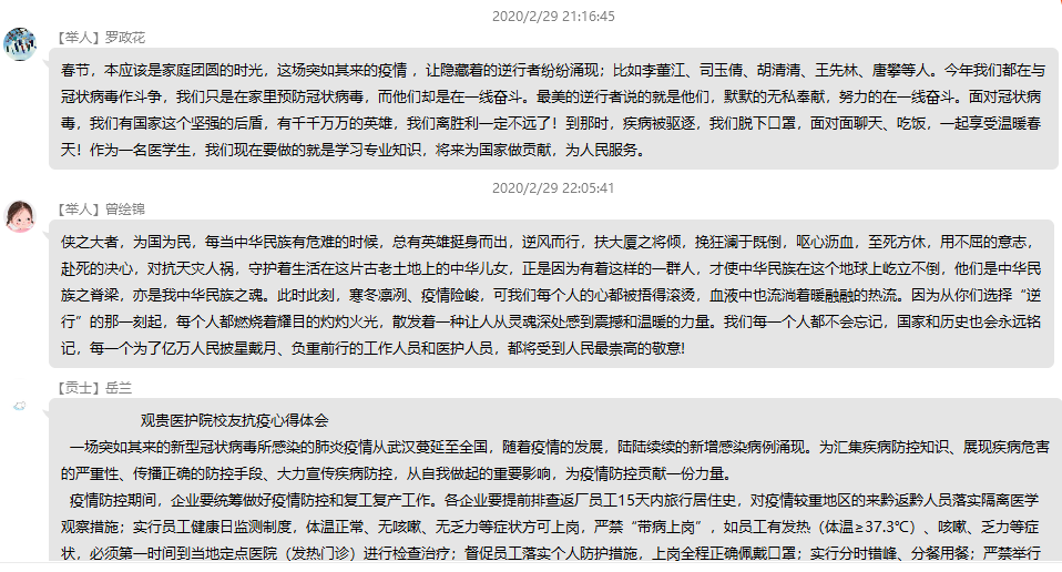 各班辅导员老师结合当前新冠肺炎疫情防控工作和员工们面临的主要问题,有针对性地开展网络思想政治教育。例如,17级、18级辅导员通过宣讲贵医护理员工的抗疫事迹和贵医护理学子做疫情防控志愿者的事迹来开展思想政治教育和专业教育,引导员工结合自身实际开展讨论,分享感悟,使广老员工对护理专业有了更大的认同,对生命健康有了更大的热爱,对志愿服务有了更大的热情。