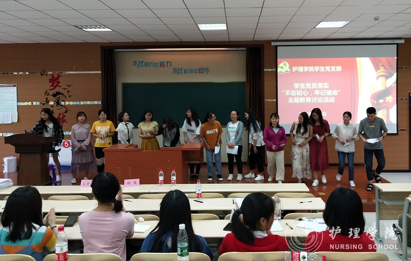 全体员工党员以班级为单位分为六个小组,每个小组以不同形式与大家分享自己对“不忘初心、牢记使命”主题教育的认识和员工党员应要如何落实要求。2016级护理学甲班的龙倩倩、张钱敏同志,围绕“初心是什么”、“为什么要不忘初心”以及“如何做到不忘初心”三个话题展开讨论,引经据典,得出结论:不忘初心要从我做起。2016级护理乙班的全体党员同志以“演说剧”的形式向大家讲述了15个已经做到了“不忘初心、牢记使命”的模范党员的感人事迹,带给全场深深的触动。2016级护理助产班的党员代表引用黄文秀和徐本禹的伟大行动事迹就“不忘初心要奉献青春”展开了话题分享,并号召大家“应当强化共产党人的初心使命意识,并落实到实际学习工作生活中去”。随着分享讨论不断深入,现场氛围愈发热烈。