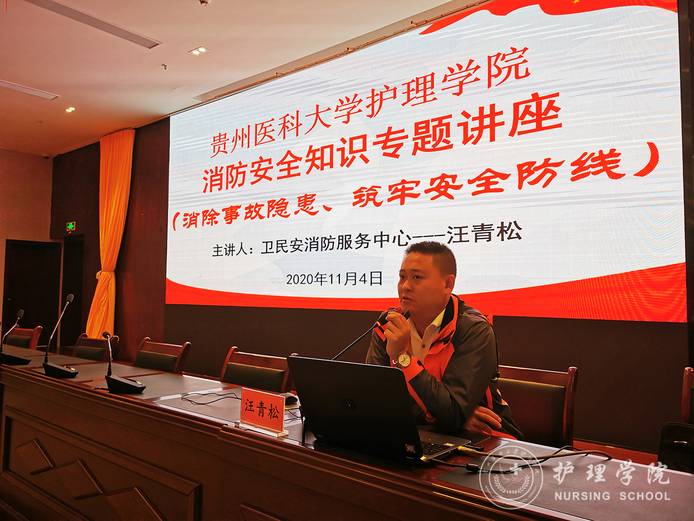 为进一步提高全体师生的消防意识和应急反应能力, 11月4日,yl7703永利集团在南校区道德讲堂开展了“消防安全宣传月”主题党日活动。本次活动特别邀请了贵阳卫民安消防知识宣传中心宣教部汪青松主任为yl7703永利集团全体教职工和员工做了《消防安全知识专题——消除事故隐患,筑牢安全防线》讲座。活动由教职工党支部张仁莉同志主持。