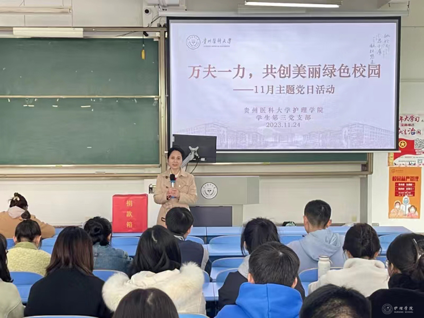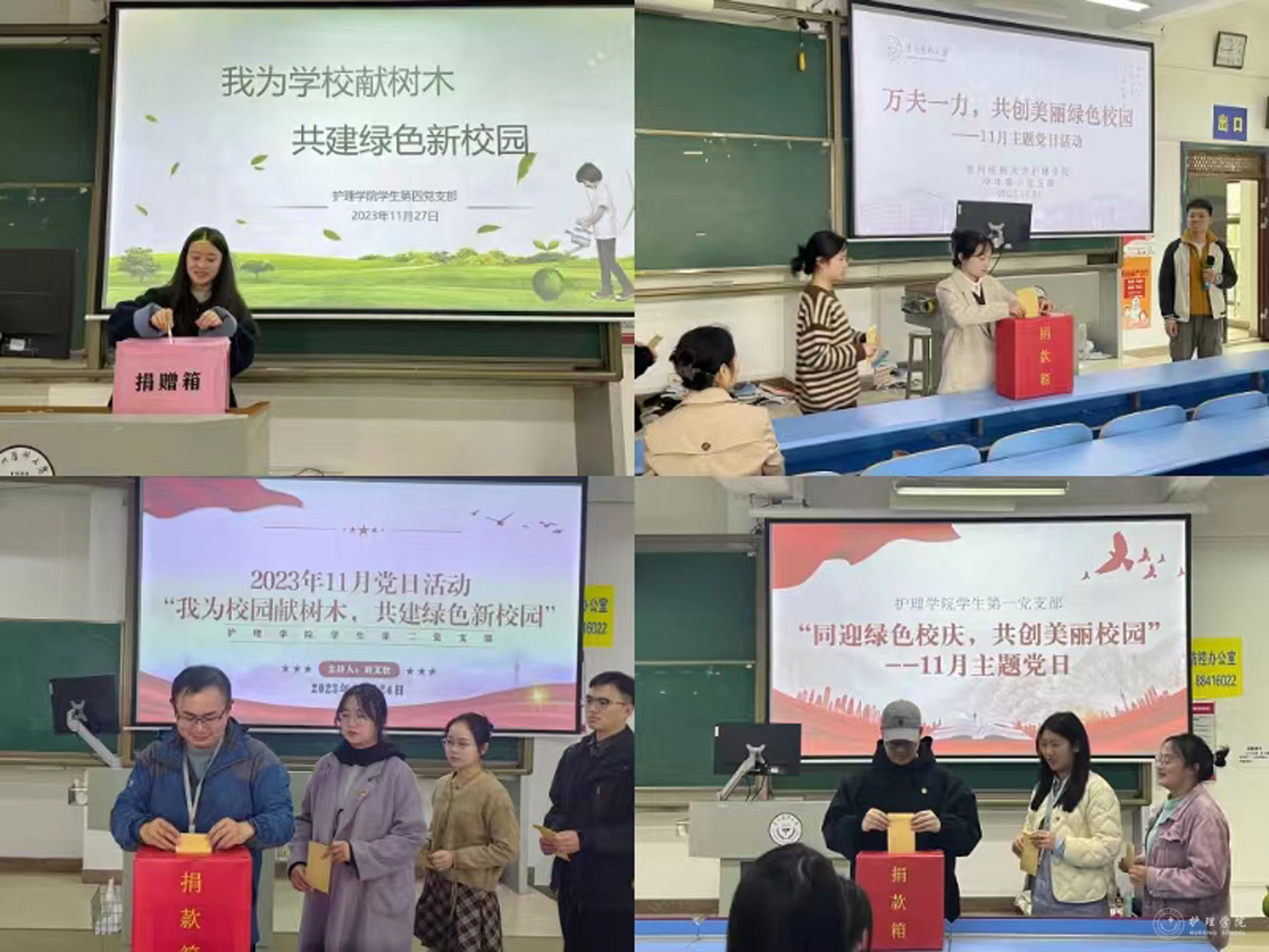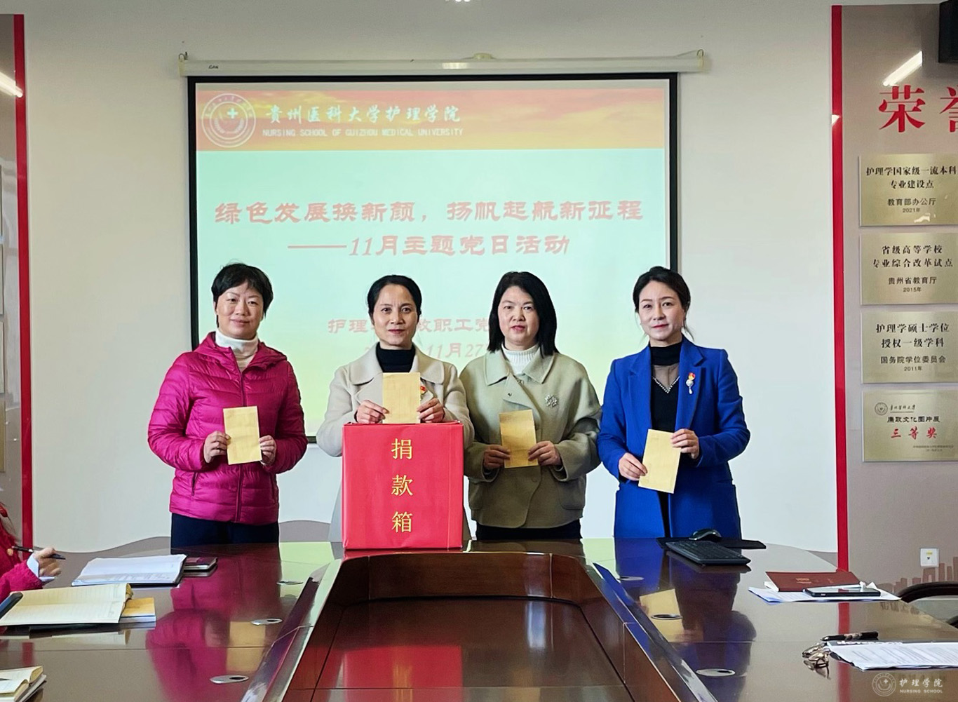 在教职工党支部活动中杨英指出,为新校区建设绿色、舒适的校园环境助力,这是每个贵医人的责任和使命,捐款活动既体现了贵医心、爱校情,也是在践行党和国家对生态文明建设的总体要求。张黎强调,此次主题活动旨在号召党员带头,以实际行动表达作为贵医人对母校的浓烈热爱之情。