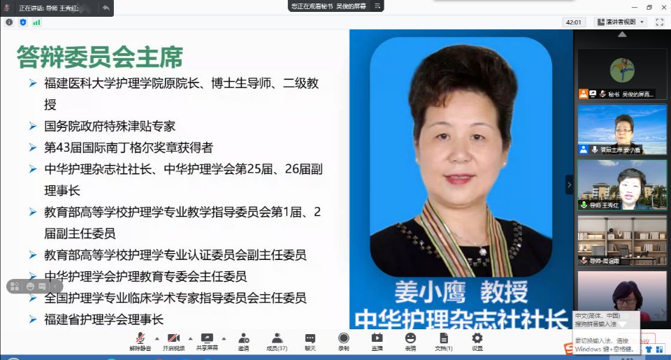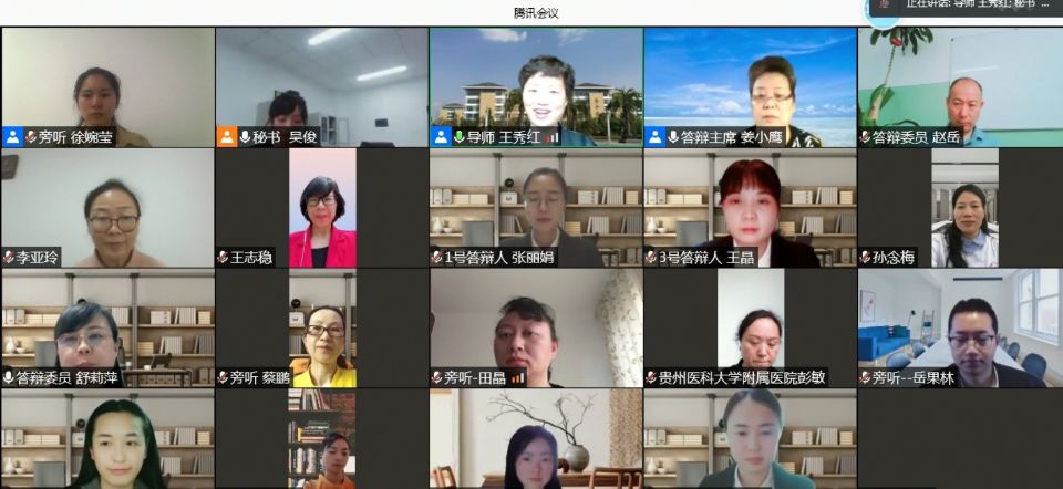 5月20日,2021届硕士研究生学位论文答辩通过腾讯会议在线进行。此次答辩特别邀请福建医科大学yl7703永利集团原经理、中华护理杂志社社长姜小鹰教授任答辩委员会主席,天津医科大学研究生常务副经理赵岳教授、循证护理研究中心主任、教研室主任王志稳教授、基础医公司副经理舒莉萍教授以及yl7703永利公共卫生公司汪俊华副教授担任答辩委员。yl7703永利集团导师、副导师、专业教师、研究生等50余人参加本次会议,研究生院督导专家全程参与。