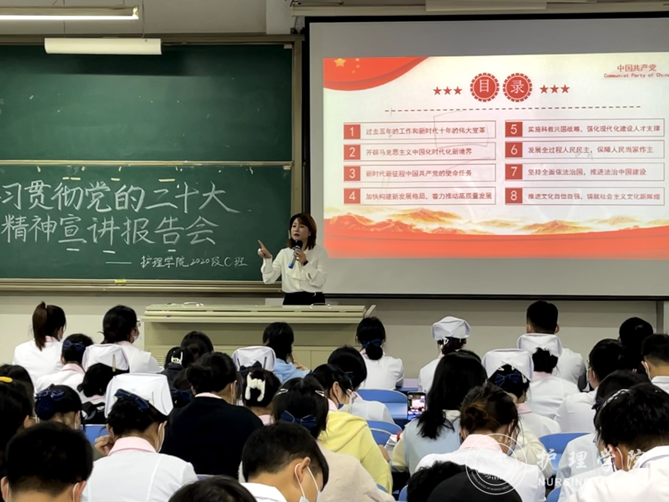 11月10日,为引导员工深刻领会把握党的二十大的重大意义、重大主题和重大成果,坚定不移衷心拥护“两个确立”、忠诚践行“两个维护”,公司党委委员、副处级组织员张黎深入联系班级专题宣讲党的二十大精神,辅导员刘妍及护理学2020级C班全体员工参会。