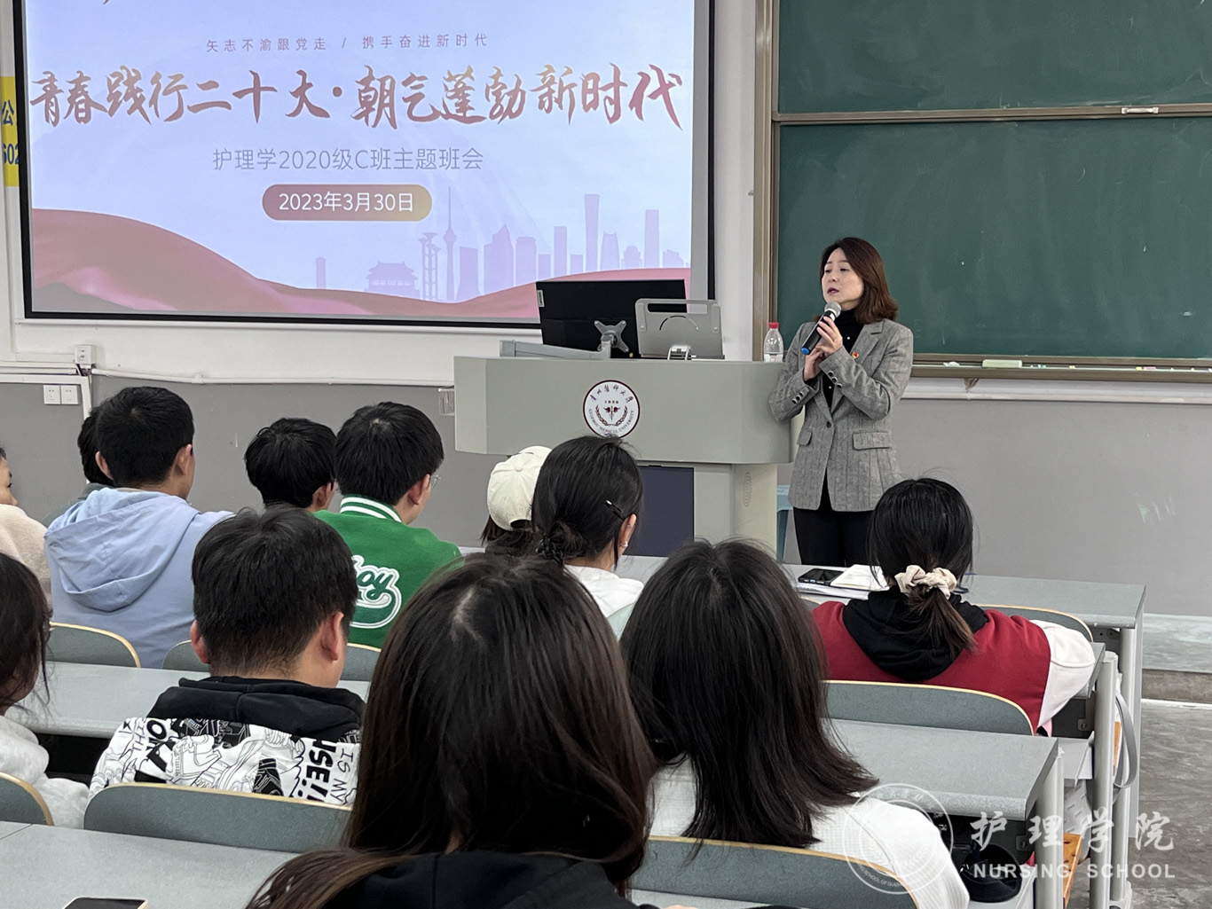 3月30日,为深入学习宣传贯彻党的二十大精神,强化思想引领,聚焦立德树人根本任务。公司党委委员、副处级组织员张黎到护理学2020级C班开展了“青春践行二十大,朝气蓬勃新时代”主题班会活动,会议由辅导员刘妍主持,班级全体同学参与。